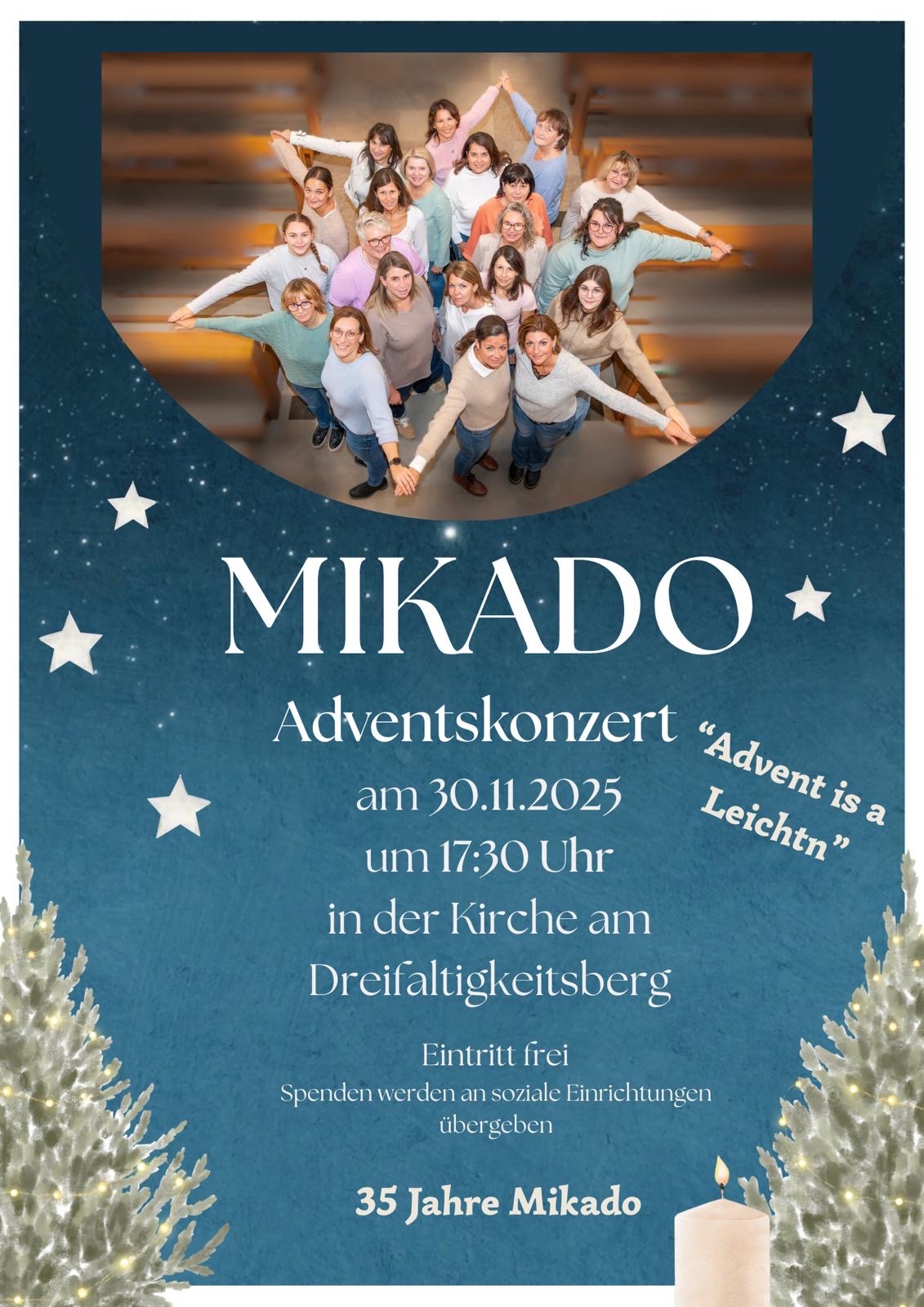 Zum 35-jährigen Jubiläum und als Einstimmung auf die „staade Zeit“ veranstaltet der Chor MIKADO aus Moosthenning ein Konzert. Unter dem Motto „Advent is a Leicht´n“ werden die Gäste mit Musikstücken, Chorinterpretationen und Texten auf den Advent eingestimmt. Mit diesem abwechslungsreichen Programm begleitet von Keyboard, Gitarre, Perkussion, Hackbrett und Querflöte werden bekannte und neue Stücke aus 35 Jahren vorgetragen. Unter der Leitung von Angelika Schuder freuen sich die 27 Sängerinnen des Chors darauf den Gästen in gewohnter Weise ihr Können zu präsentieren. Der Eintritt ist kostenlos, freiwillige Spenden werden an soziale Einrichtungen übergeben.